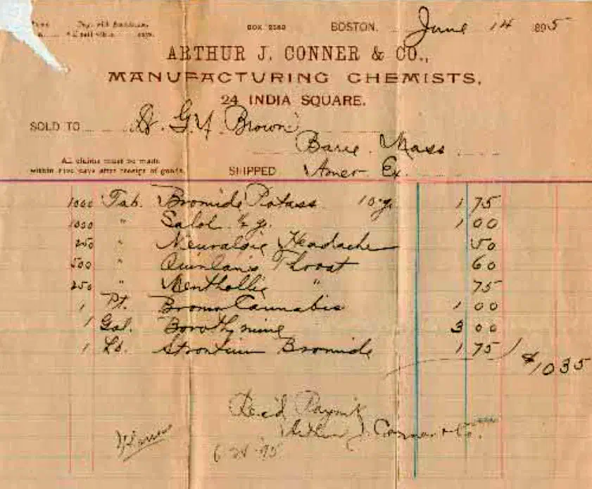 Factura extendida por ARTHUR J. CONNER & CO., MANUFACTURING CHEMIST, de Boston (EE. UU.), en la que, entre otras sustancias y productos químicos, figura el “Bromo Cannabis” (junio de 1895).