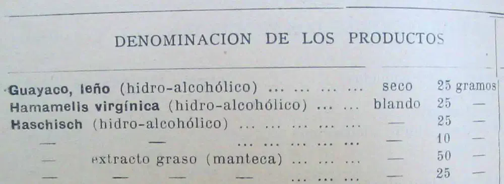 En 1932, el precio de coste al farmacéutico de 10 grs. de extracto hidroalcohólico de Haschisch era de 44 pesetas y el de 50 grs de extracto graso (manteca) de 8 pesetas. Ambos productos eran elaborados por Adrian & Cia.