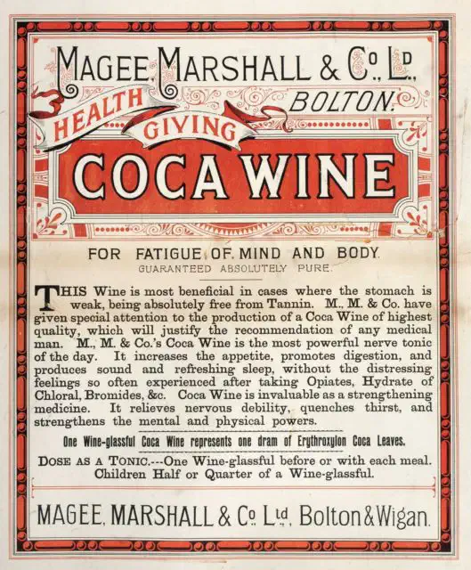 El COCA WINE de METCALF, fabricado en Boston con “hojas frescas de coca y vino puro” por THEODORE METCALF & CO., también se recomendaba para la “neuralgia, insomnio, desaliento”.