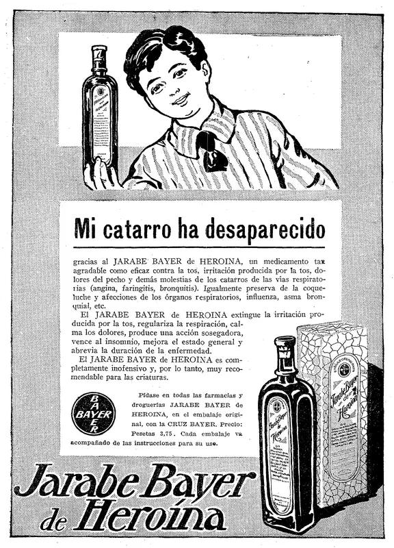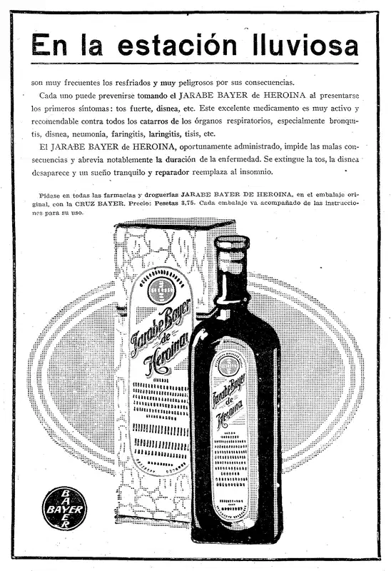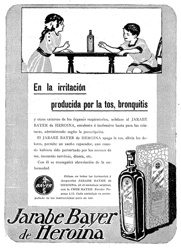 Durante la temporada de invierno y primavera del año 1912 la casa Bayer costeó una sugerente campaña de prensa en España haciendo publicidad de su jarabe de heroína. A destacar el marco cotidiano, con escenas domésticas, empleado para ilustrar la campaña.
