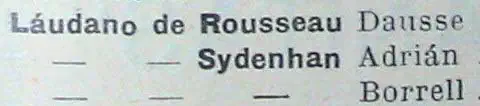Hubo otros vinos con opio anteriores (el elaborado por Paracelso, el fabricado por Zwinger, etcétera) y láudanos más modernos, como el que fabricaba W. K. HARRISON, en Leeds (Inglaterra), pero ninguno alcanzó la fama y reputación que tuvieron los comercializados por Sydenham y Rousseau. En 1925 el primero de ellos se vendía en boticas a 30 céntimos el gramo y el segundo, un poco más caro, a 40 céntimos el gramo. El láudano fue una medicina de “existencia mínima obligatoria” en todas las farmacias españolas hasta el año 1977.
