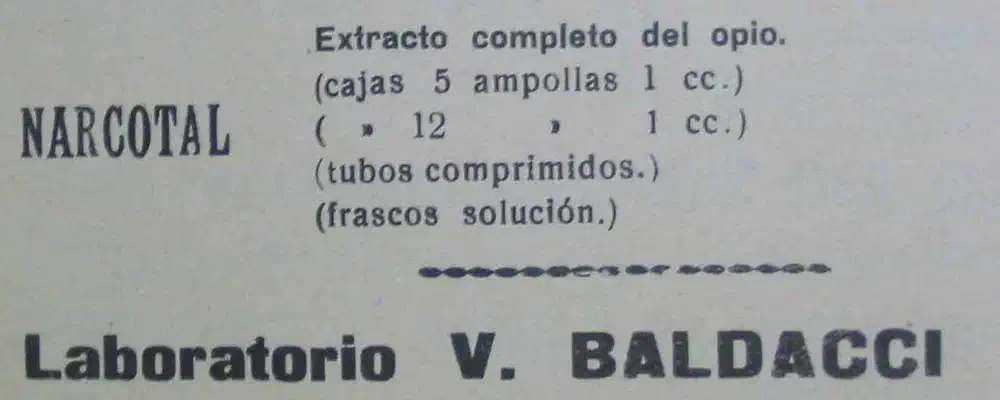 “NARCOTAL. Extracto completo del opio. (cajas de 5 ampollas 1 cc.) (cajas de 12 ampollas 1 cc.) (tubos comprimidos.) (frascos solución.) Laboratorio V. Baldacci” (1932).