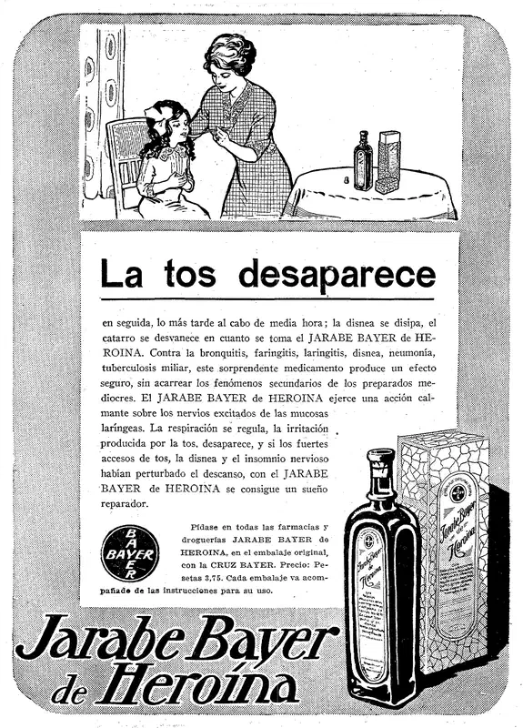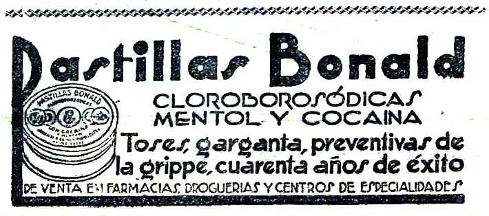 Existía, no obstante, una prohibición que afectaba no sólo a las sustancias consideradas hoy drogas ilegales, sino a todos los fármacos sin excepción: el veto de ser objetos publicitados en medios profanos, es decir, no especializados. Sin embargo, casi toda la prensa de la época incumplía sistemáticamente este precepto, convirtiéndose en su principal soporte publicitario (hasta la Gaceta de Madrid —predecesora del Boletín Oficial del Estado (BOE)— llegó a hacer propaganda, entre otras especialidades farmacéuticas, de las afamadas Pastillas Bonald con cocaína, heroína y codeína).