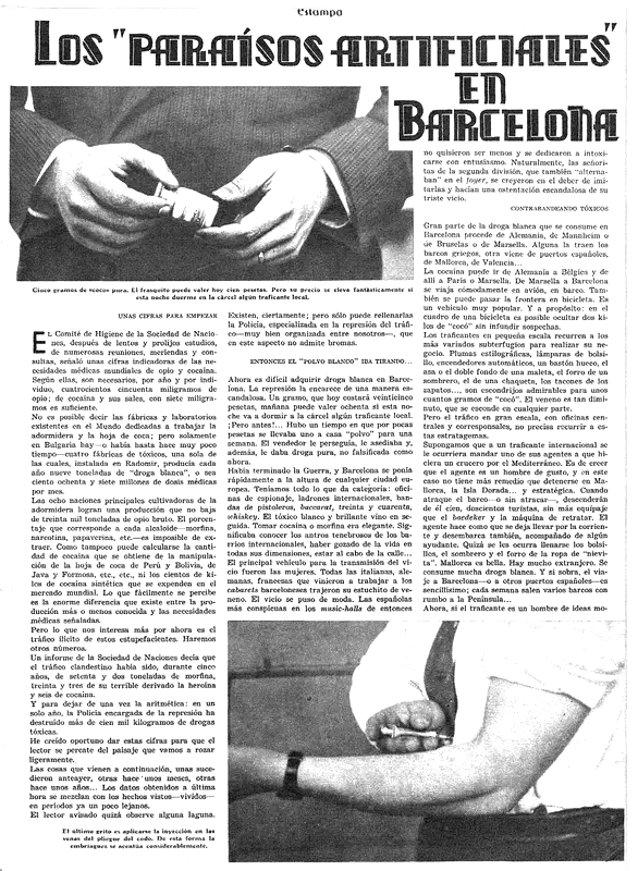 Contrabando de drogasLos “paraísos artificiales” en Barcelona (Estampa)«Barrios bajos»Cocaína en florEscándaloPortada de «Estampa»El vicio invencible de los toxicómanosBarcelona, sede del tráfico de drogas europeoCuración de borrachosUn borracho es un parásito